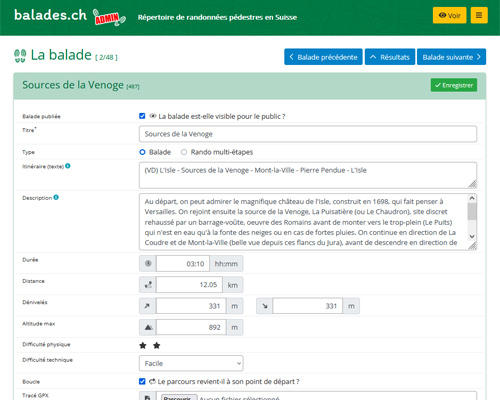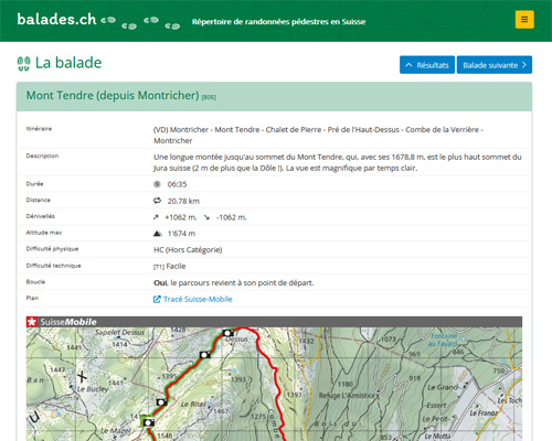 Ce répertoire de randonnées pédestres en Suisse propose d’effectuer des recherches par mots clés et filtres. Chaque balade est présentée avec une fiche complète : itinéraire, descriptif, chiffres, plan, etc.